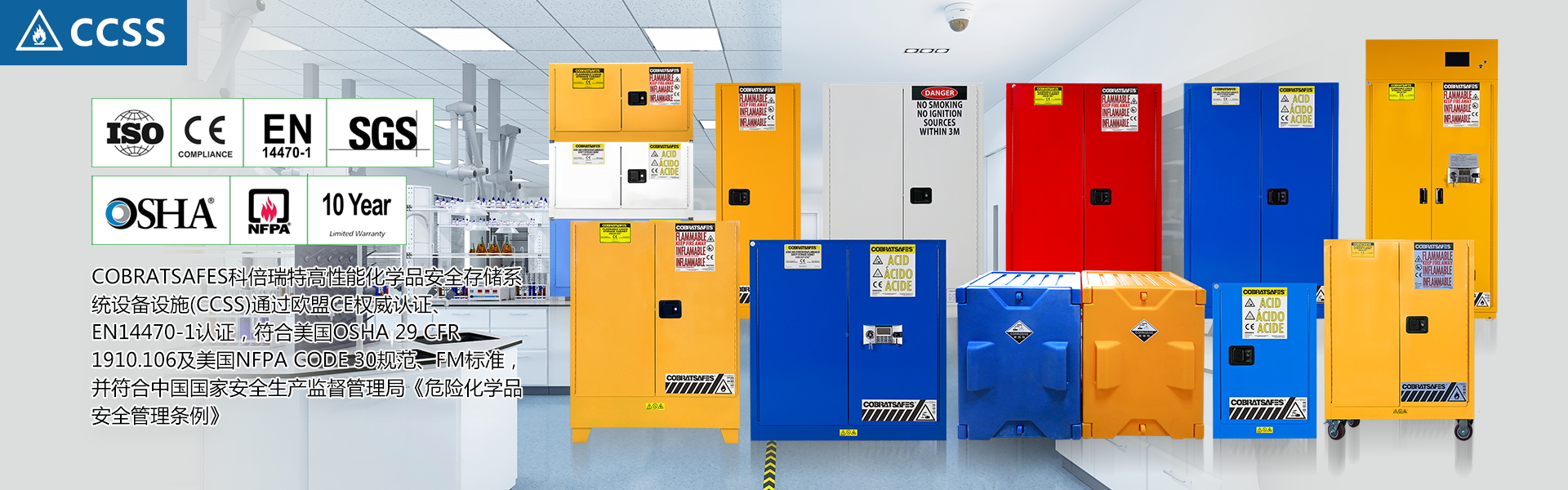 COBRATSAFES科倍瑞特坚持以“使您的工作更为安全舒心”为发展使命,我们提供经过权威认证、安全合规的系列EHS领域综合存储管理方案和科学安全环保建议,帮助我们的用户关注环境保护、员工健康、及可持续发展,并使这些产品和技术广泛用于科研教育、工业制造、医疗、新药研发、化工化学、新能源、食品科学等领域。多年来一直获得国内外众多客户的广泛信任。